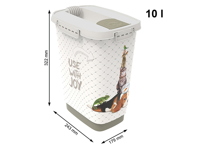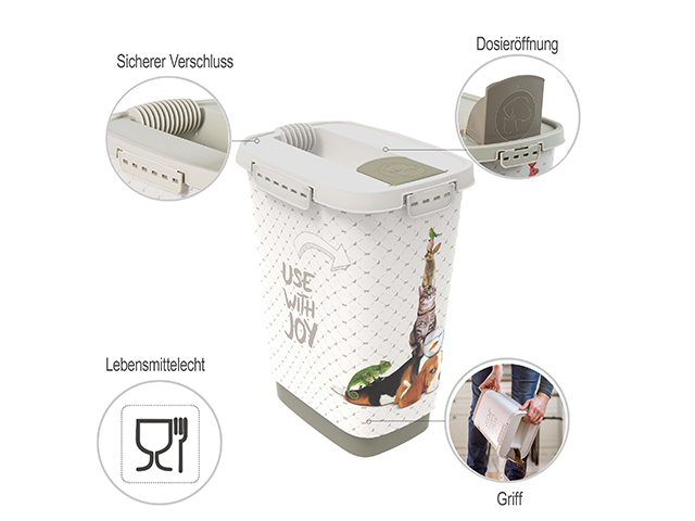 Il contenitore per il cibo secco cattura l&rsquoattenzione anche per il suo design. Grazie alla sua forma piuttosto stretta ma alta, può entrare nell&rsquoangolo più piccolo. La plastica è robusta e naturalmente priva di sostanze nocive e BPA. La pulizia è facile e veloce con acqua e detersivo per piatti, ma anche in lavastoviglie.