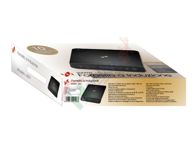 Piastra ad induzione portatile, ideale per portarla in viaggio, mare, campeggio con pannello in cristallo nero di grado A, tipo di controllo soft touch, timer di 4 ore, 4 livelli di potenza display digitale e temperatura, cursore multifunzione, 10 gamma di selezione potenza da 60 a 240 gradi, multisistema di protezione sicurezza, sistema sicurezza bambino, rilevazione mancanza padella o errata rilevazione, sistema di avviso di bassa e alta tensione, dotato di sistema di messaggio di errore diagnostico.